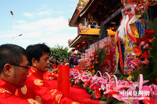 向福德正神敬献鲜花。(中国台湾网 董洁 摄)