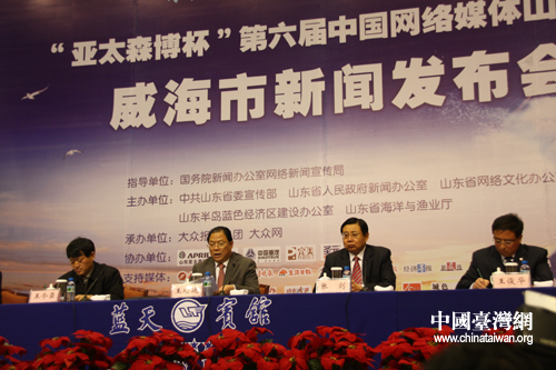 中国台湾网10月28日威海消息 10月27日上午,威海市委、市政府为亚太森博杯“聚焦山东半岛蓝色经济区”第六届中国网络媒体山东行采访活动举行新闻发布会。威海市委书记、市人大常委会主任王培廷致辞时表示,威海将重点培养海产品生产加工、船舶修造等六大基地,强力带动蓝色经济高速发展。