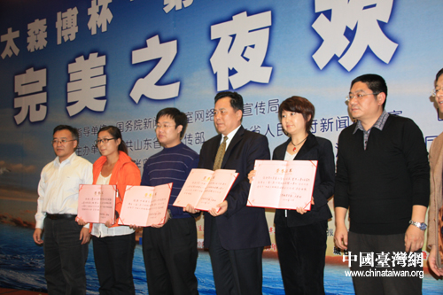 欢送仪式上,为第六届中国网络媒体山东行采访活动的支持与合作单位山东亚太森博浆纸有限公司、中国重汽、完美(中国)日用品有限公司、圣元营养食品有限公司颁发荣誉证书。(中国台湾网 刘海伟 摄)