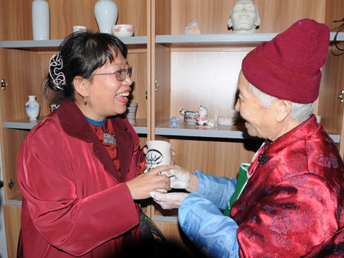 83岁的老人彭朝珍还将亲手制作的四川脸谱图案笔筒送给陈芳姿。图片来源:四川省台办