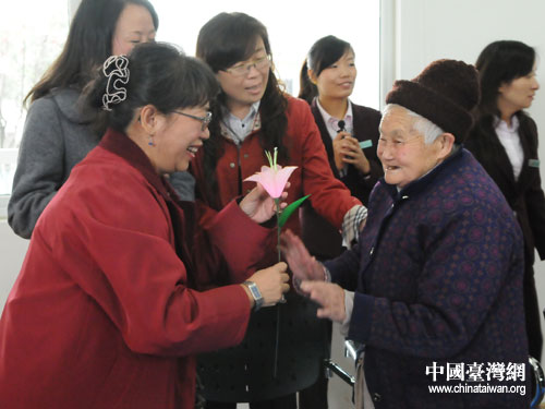 都江堰市综合社会福利院老人将亲手制作的花送给陈芳芝。图片来源:四川省台办