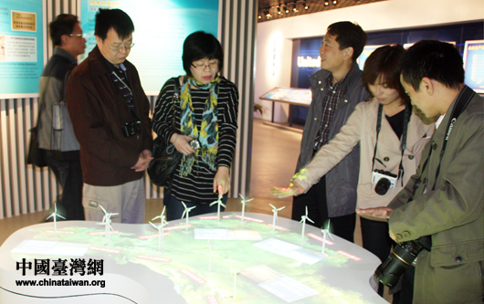 在国电联合动力,先进的风力发电设备吸引了两岸媒体的关注。由于岛内经常受到台风影响,台湾媒体向企业工作人员询问了风力发电机的抗风性重点等问题,并在模型前亲身体验了公司的产品。
