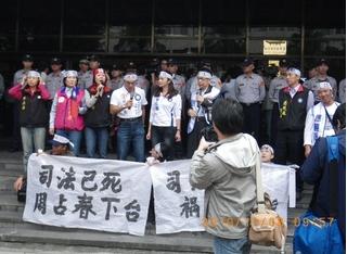 台北市议会国民党团,由国民党团书记长秦俪舫领军,偕同李新、戴锡钦、王正德、林奕华、厉耿桂芳等人,前往台北地方法院抗议“二次金改”弊案的不当判决。抗议民众除蛋洗“周X春”人型立牌外,还焚烧前台湾地区领导人陈水扁的照片。