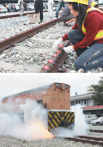 花莲运务段昨天销毁全台最后一批响炖,员工将468个预备报废的响炖,一个个装在铁轨上(上图),当列车压过响炖时,产生巨大声响与浓烟(下图)。图片来源:台湾《联合报》