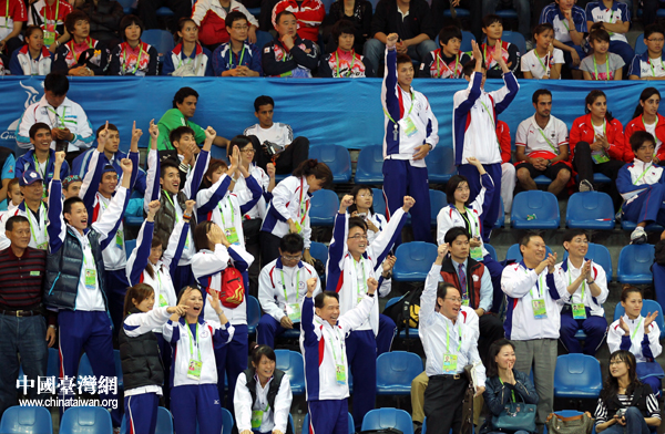 中华台北跆拳道队队员、教练员为黄显咏助威(中国台湾网 钟宝华 摄)