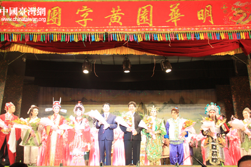 台湾明华园黄字剧团与漳州市芗剧团同台献演大型歌仔戏《周公法斗桃花女》,图为剧团团长及主要演员谢幕。(中国台湾网 胡珊珊 摄影)
