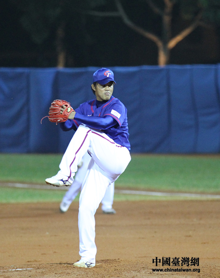 18日晚,中华台北队凭借出色发挥4 :3力克日本队挺进决赛。图为中华台北队员投球瞬间。(中国台湾网 沈鹏 摄)