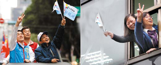 选举倒数3天,台北市长候选人郝龙斌昨天在中正区进行“车队扫街”,支持者从高楼窗户探头出来为他加油打气。记者陈柏亨/摄影 图片来源:台湾《联合报》