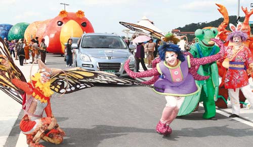 台北花博会参观人数预估在本周结束前突破100万人。纸风车剧团的“毛毛虫幸福大游行”也将加场演出,将由纳智捷汽车赞助经费,增加30场游行。昨天的游行队伍中还加入两部电动车,让队伍更为壮观。(记者徐世经/摄影 图片来源:台湾《联合报》)