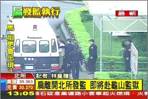 中国台湾网12月2日消息 综合台湾媒体报道,陈水扁、吴淑珍夫妇因龙潭购地案及前101董座陈敏薰人事案遭判刑定谳,今天下午1时37分左右,陈水扁囚车在警方车队戒护下抵达台北监狱,入监服刑。