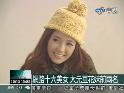 据报道,台湾网络知名部落格公布今年人气最旺的正妹型男排行榜,《大学生了没》节目固定班底的大元,以自然甜美的模样,被封为新一代的网络甜美女神,部落格人气直冲700多万,获得正妹排行第一名。
