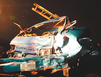 蓝色货车昨晚在新城乡七星潭德燕渔场旁路旁,与载有10名陆客团的游览车对撞,车头严重变形。 图片来源:台湾《联合报》