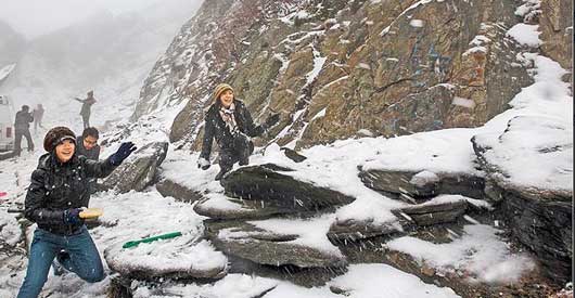 合欢山昨天下午飘下瑞雪,山头染上银白粉妆,赏雪民众兴奋地打起雪仗。图片来自网络