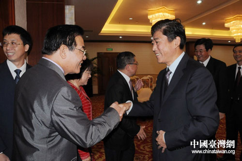 中共海南省委副书记于迅与台湾无党团结联盟主席林炳坤在一起交谈。(海南台办唐小平 摄)