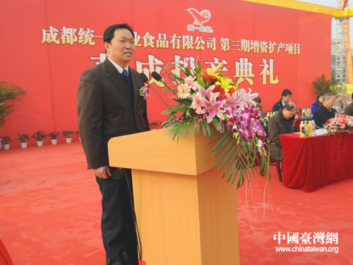 成都市台办副主任唐明建、温江区委副书记王斌、成都统一企业食品有限公司总厂长林金龙分别在典礼上致辞。典礼结束后,与会嘉宾还一同参观了已落成投产的成都统一企业食品有限公司第三期增资扩产项目生产线。