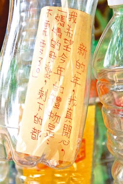 渴求亲情▲云林县古坑乡偏远小学华南小学的饮料瓶心愿树,让全校70个小孩放上自己的愿望,其中有个小女孩写下“希望今年礼物是妈妈的母爱,剩下的都不需要了”,令人鼻酸。图片来源:台湾《中国时报》
