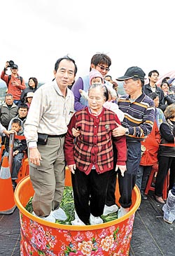 91岁高龄的罗汤月妹女士(中)在亲人扶持下和半岁曾孙女一家四代一起踩咸菜。图片来源:台湾《中国时报》