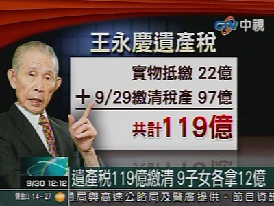 王永庆2008年10月突然过世,据指出,王永庆在岛内共留下595亿元的遗产,共需缴交119亿元的遗产税,其中,在去年9月有113亿元入帐,使得9月份的遗产税实征净额达133亿元,创下的史上单月新高纪录。另外6亿元的实物抵缴部分,也在11月由台当局“财政部国有财产局”完成土地变更为公有。119亿元的遗产税悉数上缴,如果再加上28亿元的赠与税,合计王家去年共缴交了147亿元的遗赠税。(中国台湾网 冯江)