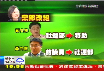 报道称,此次人事改组,民进党原政策会执行长刘建忻升任民进党第3副秘书长;原青年部主任黄重谚接手政策会;而原社运部主任郭文彬,将转任特助,遗缺延揽卸任议员黄向群。此次改组名单比较敏感的是黄向群,他过去亲苏色彩鲜明,如果蔡英文真的投入2012“大选”初选,将极可能和苏贞昌形成竞争关系,两大阵营现在已经开始抢人挖角,苏蔡2012出线大战浮上台面,正式拉开序幕。