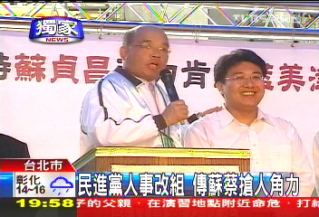 中国台湾网1月20日消息 据台湾TVBS电视台报道,国民党近日发生人事大地震,民进党也“跟风”进行人事改组,预计最快下周公布。其中值得一提的是,蔡英文将延揽苏贞昌派系的前议员黄向群进入民进党中央。外界对此次“抢人战”解读称,苏贞昌、蔡英文原本就关系紧张,未来又极可能是2012“大选”初选竞争对手,蔡英文此举是在示意苏贞昌她将出马参选2012,苏蔡2012出线大战将正式拉开序幕。