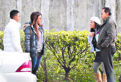 张韶涵父母(右起)一现身,儿子(左)一脸害怕往后退,由友人挡在前面。来源:台湾媒体