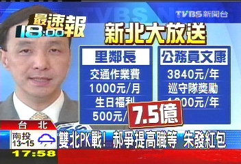 中国台湾网1月21日消息 据台湾TVBS电视台报道,台北市、新北市近日在提升公务人员待遇方面相互较劲,台北市长郝龙斌表示,他要帮台北市的公务人员争取职等升级,理由是台北市业务量庞大,应该给公务人员更好的福利。同样,新北市长朱立伦也决定给公务人员发“红包”,包括基层的邻、里长和警察及消防员等,每个月发放1000元(新台币,下同)交通补助,并增加他们的文康费用。郝龙斌、朱立伦两人替基层谋福利,更像是台北市与新北市在争取领头地位。