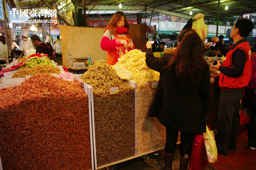 鱿鱼丝以各种口味及色彩,向往来的的游客尽情招手。 也有摊商销售福袋,现买现兑奖,逛街也可赌赌运气。