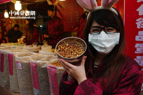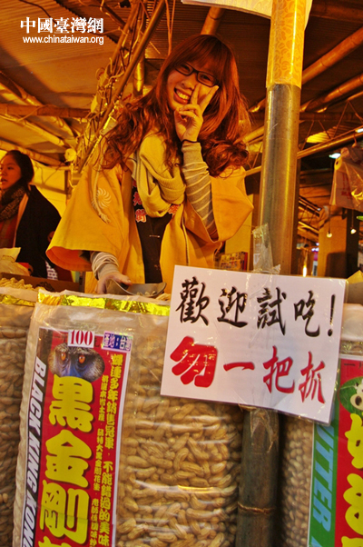 鱿鱼丝以各种口味及色彩,向往来的的游客尽情招手。 也有摊商销售福袋,现买现兑奖,逛街也可赌赌运气。 口罩美女,向笔者推销个头很小的蚕豆酥。 黑金刚是花生的品种,透过正妹展颜一笑,过客通通变成了买家。