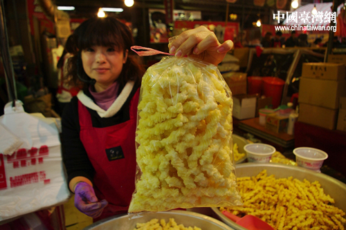 鱿鱼丝以各种口味及色彩,向往来的的游客尽情招手。 也有摊商销售福袋,现买现兑奖,逛街也可赌赌运气。 口罩美女,向笔者推销个头很小的蚕豆酥。 黑金刚是花生的品种,透过正妹展颜一笑,过客通通变成了买家。 这叫卡哩卡哩,现场油炸制作,从小笔者就爱吃这味。 第1页第2页第3页第4页第5页