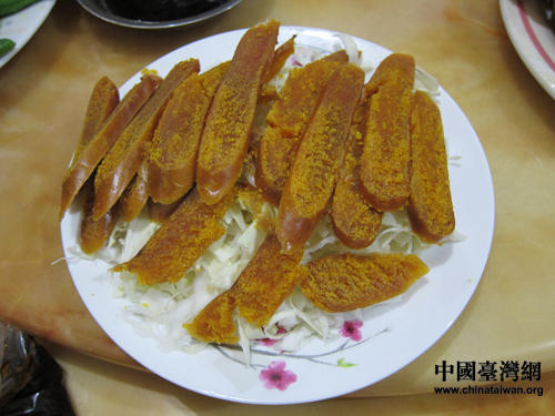 焖烤乌鱼子。色泽金黄,犹如黄金遍地;因其卵多,又有多子多孙多福气之意。