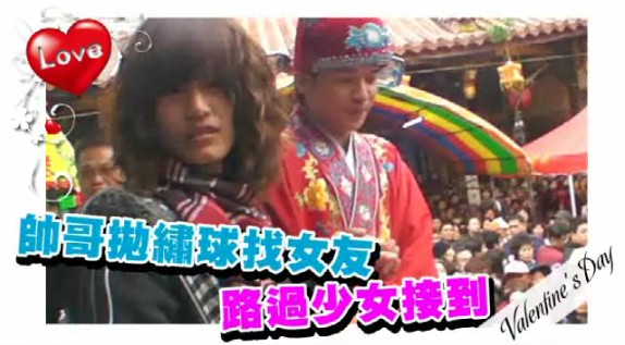 中国台湾网2月14日消息 据台湾媒体报道,彰化县鹿港城隍庙昨天举办一场别开生面“男丁抛绣球找女情人”活动。男主角潘冠志抛出的绣球,被台下一名17岁高二女生叶愉萍接到。叶愉萍上台后,面对主持人艺人蔡闰询问后说:“愿意交往试看看!”,立即获得台下民众热烈的掌声和祝福。