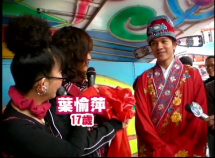 帅哥潘冠志只好再抛第二次,结果接到绣球的女主角是17岁、就读高二的女生叶愉萍。叶愉萍说:“刚刚拜完城隍爷走出庙门,在路过舞台前时就接到一颗红色大绣球,是发生什么事?”等到她被半推半就请上台后才知道是在举办“抛绣球”活动,直说真的好像是接到“天上掉下来的礼物”。