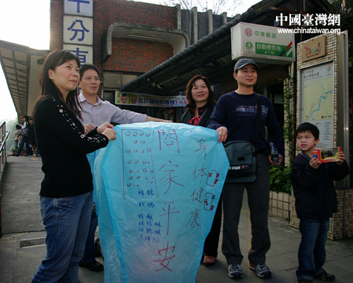 天灯也可像风筝般以绳子系着施放。 台湾花布与天灯结合,成为漂亮的灯饰,颇受民众青睐。 在十分车站前留影,是观光客来平溪最喜欢的取景点。 第1页第2页第3页