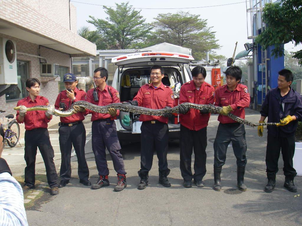 据报道,高雄市消防局今天中午接到报案指出,高雄市某高速公路截流站的排风管上方突然出现不速之客——一条超级大蟒蛇。因蟒蛇十分巨大,先到现场的两名消防队员不敢轻举妄动,于是通报勤务中心,后来连同6名支援队员合力将蟒蛇擒获。