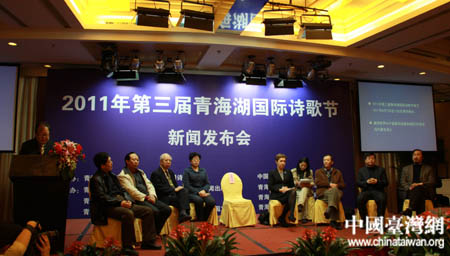 中国台湾网2月24日北京消息 青海省人民政府、中国诗歌学会、中国少数民族作家学会今(24日)日在京共同举办“2011年第三届青海湖国际诗歌节”新闻发布会。中共青海省委常委、宣传部长、诗人、青海湖国际诗歌节主席吉狄马加,立陶宛驻华大使丽娜?安塔纳维切涅,翻译家叶廷芳、赵振江等参加了新闻发布会。