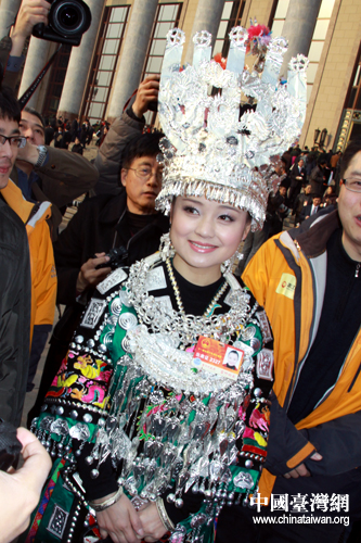 来自贵州省黔东南苗族侗族自治洲,被誉为苗家百灵的“80后”全国人大代表阿幼朵。(中国台湾网 董洁 摄)