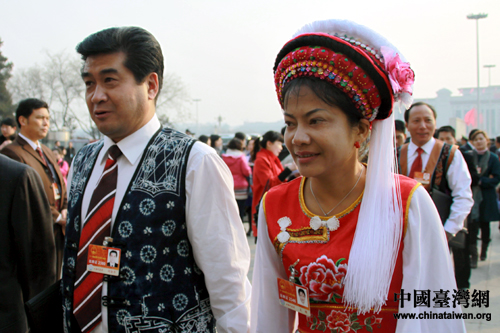 3月5日,十一届全国人大四次会议在北京人民大会堂开幕。身穿民族服饰的大代表走入会场,成为两会一道亮丽的风景。(中国台湾网 董洁 摄)