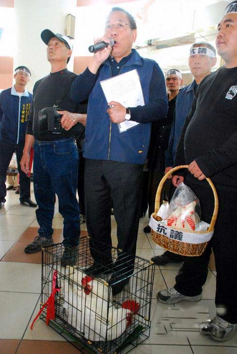 有抗议民众提着铁笼,内装2只白鸡,曾顺良同他们一同到庙里斩鸡头发誓抗争。图片来源:台湾媒体