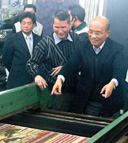 苏贞昌(右)昨日参观新北市印染厂,至于是否投入2012“大选”,他首度松口表示“正认真考虑中”。图片来源:台湾《联合报》
