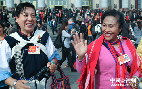 全国政协十一届四次会议闭幕,图为身着民族服装的政协委员步出人民大会堂。(中国台湾网 陈佳慧 摄)