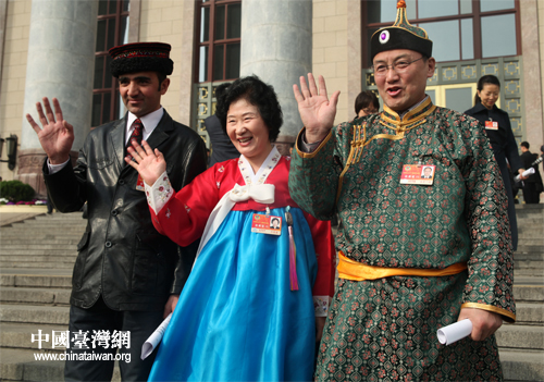 全国政协十一届四次会议闭幕,政协委员身着民族服装合影留念。(中国台湾网 陈佳慧 摄)