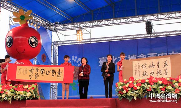 著名书法家邱宗康、石瑞芳为花博献上书法作品(陕西省台办 张群莉 摄)