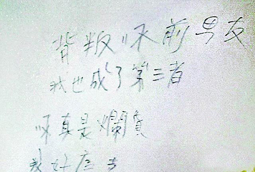 警方表示,徐文彦和女友分手后,多次要到对方住处取回计算机、枕头等私人物品,但因前女友都避不见面没拿成。昨天凌晨3时许,徐文彦潜入前女友住处大楼,打开气窗后将门锁打开进入屋内取东西,接着竟以签字笔在墙上写着“背叛你前男友,我也成了第三者。”“你真是烂货,我好庆幸,我的东西全还给我。”然后拿走两个枕头及计算机。