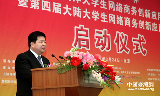 国台办主任助理龙明彪在“首届海峡两岸大学生网络商务创新应用大赛暨第四届大陆大学生网络商务创新应用大赛”启动仪式上致辞(中国台湾网 普燕 摄)