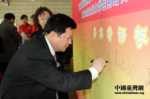 启动仪式开始前,国务院台办主任助理龙明彪在嘉宾寄语板留言。 (中国台湾网 王伟 摄)