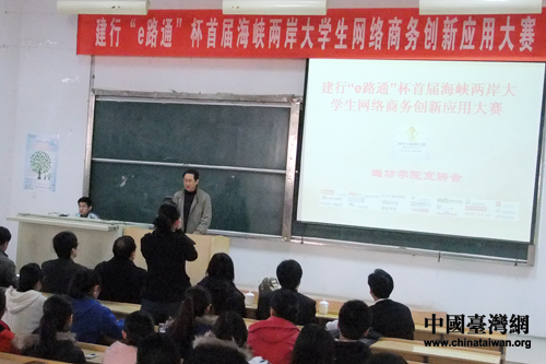 3月26日下午,首届海峡两岸大学生网络商务创新应用大赛暨第四届大陆大学生网络商务创新应用大赛在潍坊学院举行入校宣讲会。(图片来源:潍坊学院)