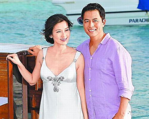 林熙蕾(左)穿象牙白礼服与新郎杨晨在马尔代夫登小船拍婚纱照。图片来自网络