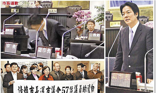 台南议会开议前,议员要求市长赖清德道歉,赖清德随后在议事厅上向议员鞠躬道歉。图片来自网络