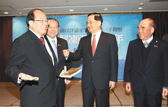 李建荣(左一)昨天举行新书《解冻两岸20年》发布会,国民党荣誉主席连战(右二)、台当局“考试院长”关中(左二)、前台当局“行政院长”郝柏村(右一),前往祝贺。图片来源:台湾《联合报》