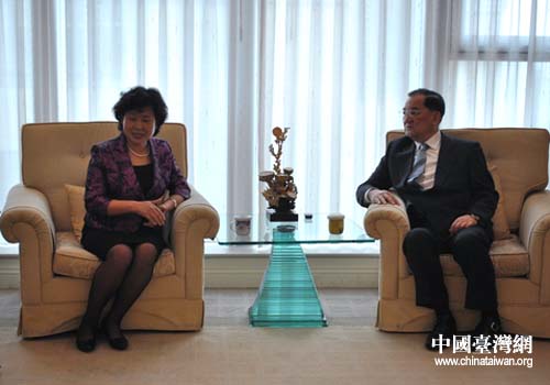 图为朱静芝率团拜会中国国民党荣誉主席连战。(陕西省台办 赵有奇 摄 )